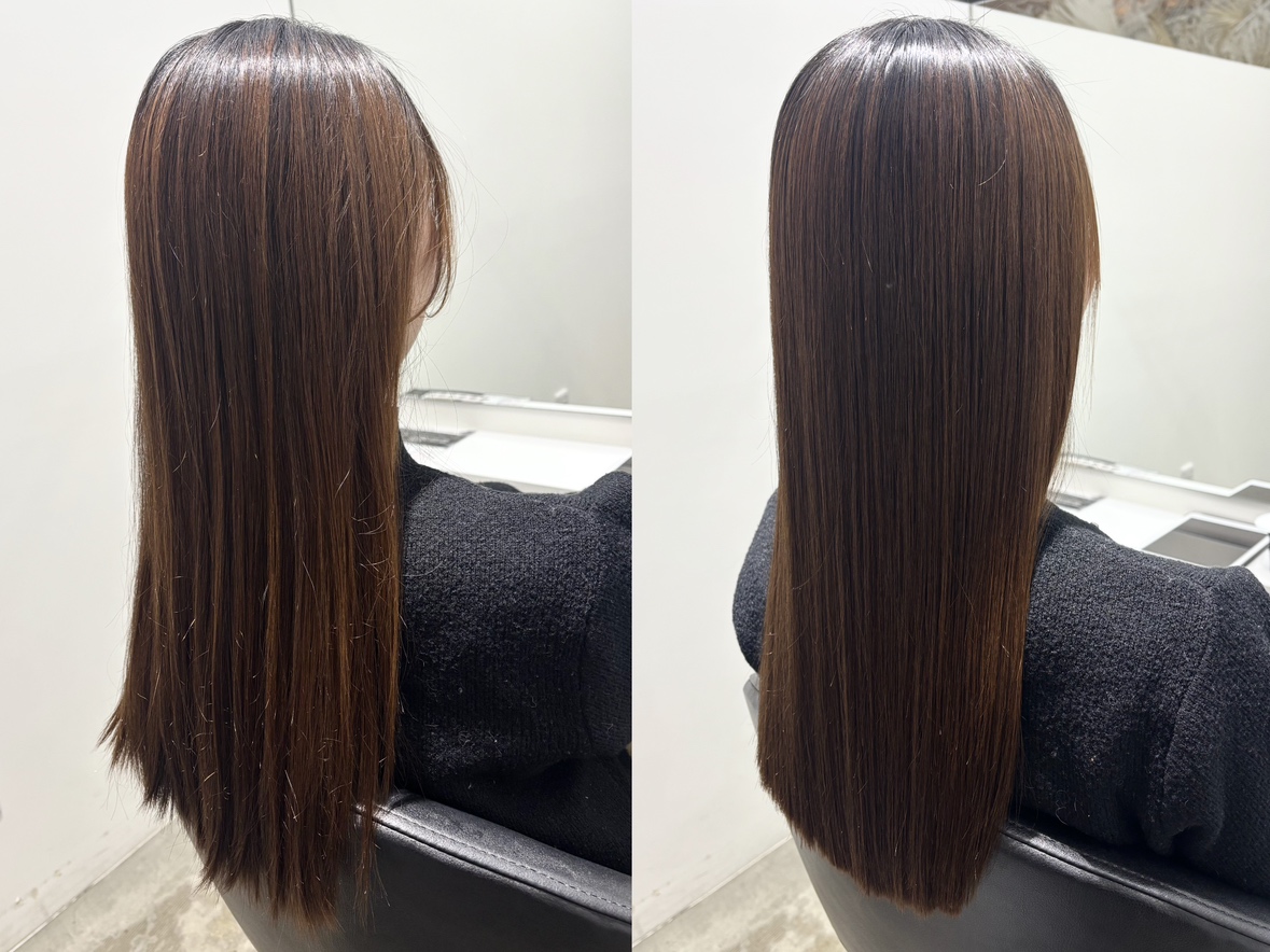 これまでかけると髪がギシギシになる方、細くなってしまったエイジング毛に対しても、酸性縮毛矯正なら施術が可能なケースが大幅に増えました。髪の体力を削りすぎず、潤いを残しながら整えていくことができます。